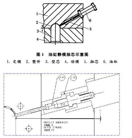 當(dāng)滑塊行程較大或動(dòng)模滑塊向動(dòng)模邊傾斜較大時(shí),如用斜邊抽芯,其受力較差,容易損壞;可用油缸而改善受力狀況。