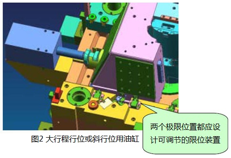 在模具結(jié)構(gòu)中油缸應(yīng)有行程限位控制開關(guān),確?;钊讼?;同時(shí)應(yīng)具備模具生產(chǎn)時(shí)自動(dòng)控制所必須的信號(hào)源。