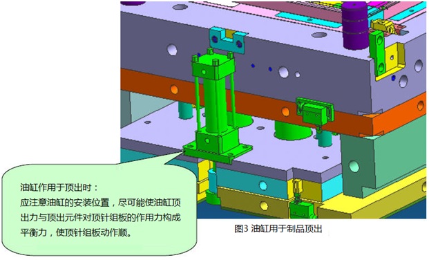 在此類應(yīng)用中,應(yīng)注意油缸的安裝位置,盡可能使油缸頂出力與頂出元件對頂針組板的作用力構(gòu)成平衡力系,減少頂針組板動(dòng)推板導(dǎo)柱的傾覆力,使頂針組板動(dòng)作順。