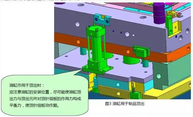 在此類(lèi)應(yīng)用中,應(yīng)注意油缸的安裝位置,盡可能使油缸頂出力與頂出元件對(duì)頂針組板的作用力構(gòu)成平衡力系,減少頂針組板動(dòng)推板導(dǎo)柱的傾覆力,使頂針組板動(dòng)作順。